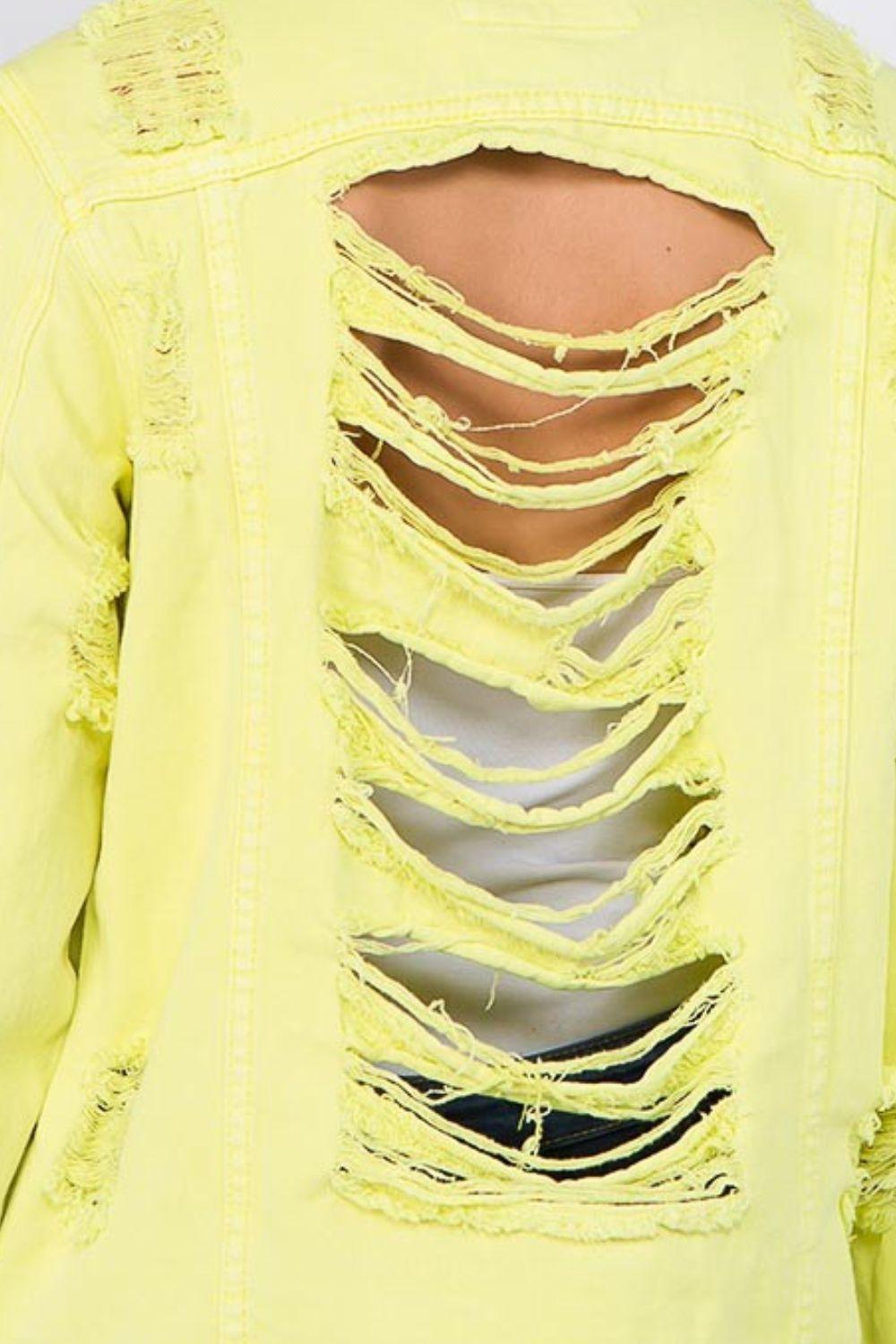 A distressed back denim jacket features a button front closure, distressed trims, and a slim-fitting design. This rugged yet stylish garment combines the classic look of a denim jacket with modern distressed details for a unique edge. The button front closure provides a secure and adjustable fit, while the distressed trims add a worn-in, vintage-inspired vibe. The slim fit of the jacket offers a sleek and flattering silhouette that can easily be layered over a variety of outfits. Whether worn with casual jeans or dressed up with a skirt, a distressed back denim jacket adds a cool and effortless touch to your look. Upgrade your wardrobe with this versatile piece that brings a touch of urban chic to any ensemble.