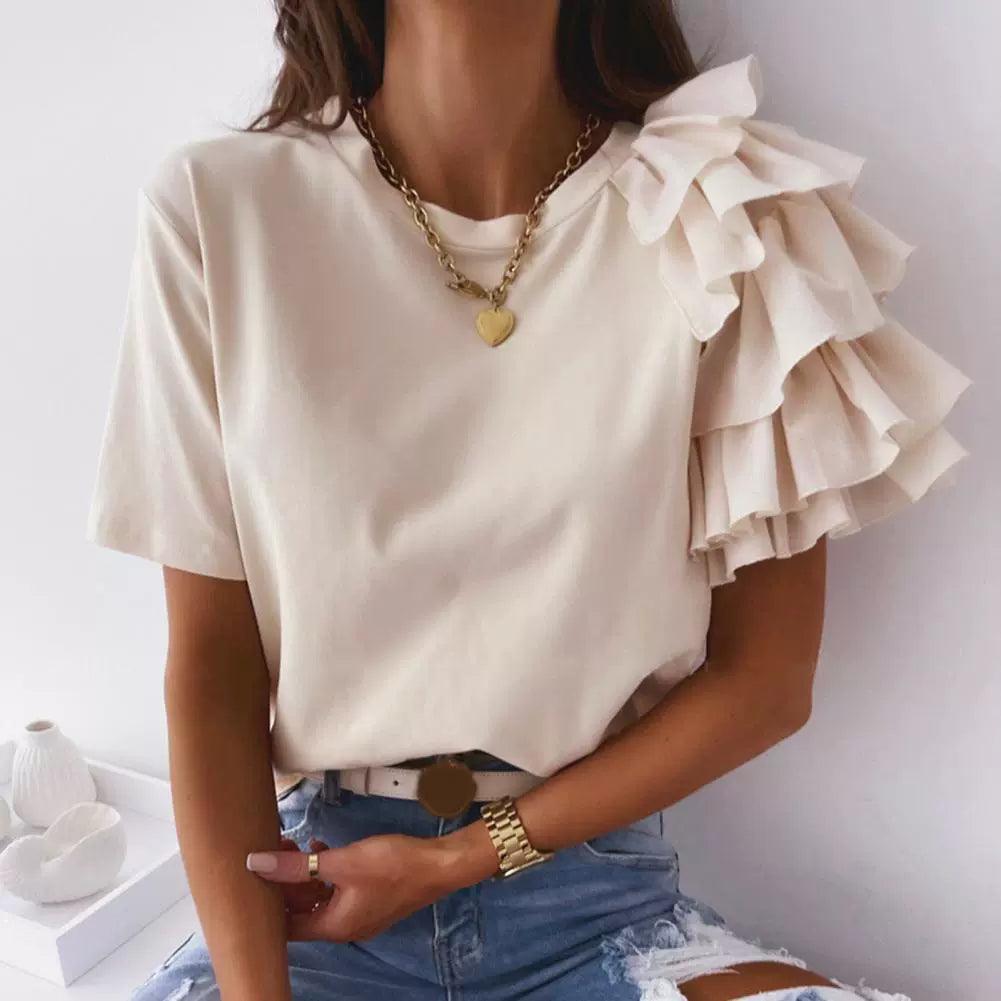 Embrace effortless style with our asymmetric sleeve loose T-shirt top for women. Perfect for summer, this blouse combines comfort and a unique, trendy design.