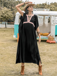Contrast Trim Notched Slit Short Sleeve Midi Dress