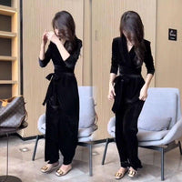 Elevate your autumn wardrobe with our stylish Hepburn-style V-neck jumpsuit for women. This tight-fitting design features a flattering strap waist, combining elegance and comfort for a chic look. Perfect for any occasion, this jumpsuit embodies the essence of internet celebrity fashion and timeless sophistication.