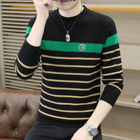 Stay warm and stylish with this high-end men's color-blocking striped sweater. Perfect for autumn and winter, this round-neck, casual bottoming sweater offers a fashionable and cozy fit. Ideal for adding a touch of class to your casual wardrobe.