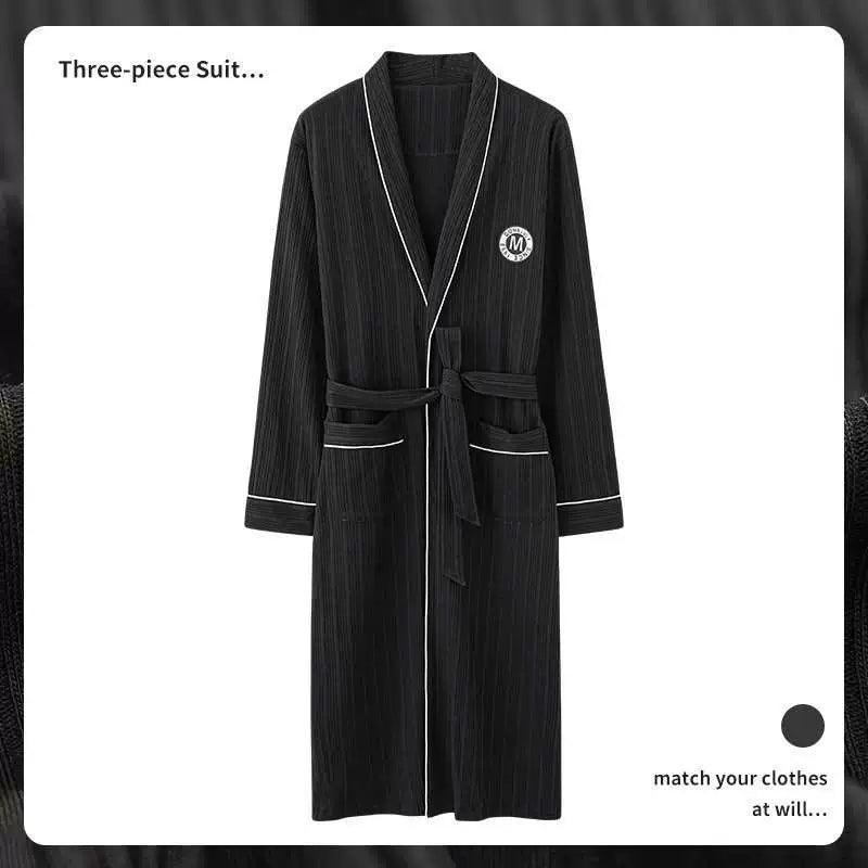 Relax in style with our Men’s Nightgown Spring and Autumn Long-Sleeved Bathrobe. Perfect for the transitional seasons, this robe features long sleeves and a comfortable fit, keeping you cozy during cooler mornings and evenings. Made from soft, breathable fabric, it ensures you stay comfortable throughout the day or night. The robe’s long design provides full coverage, while the adjustable tie waist allows for a custom fit. Ideal for lounging at home or unwinding after a bath, this bathrobe offers both warmth and style.
