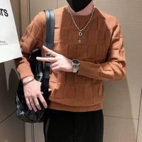 Stay stylish and comfortable with this men's solid color round neck sweater. Featuring a trendy Korean-style checkerboard plaid design, this wool sweater is perfect for casual wear or as a cozy bottoming layer. Ideal for both fashion and warmth.