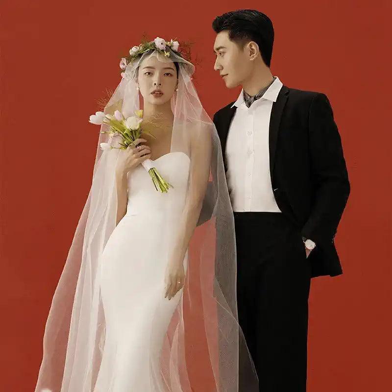 new mermaid-style strapless wedding dress, crafted in satin for a sleek, slimming fit. Perfect for brides seeking a simple yet elegant look with a stunning train.