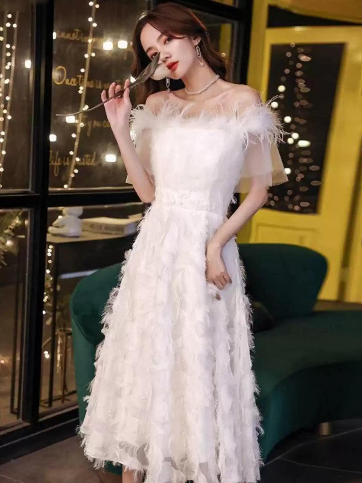 New off-shoulder white dress, featuring an elegant and luxurious design. Perfect for parties, birthdays, and special events with a sophisticated, fairy-like vibe.
