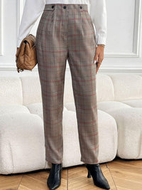 Elevate your style with the Perfee Plaid Straight Pants, designed for the modern wardrobe. These chic pants feature buttoned details and convenient pockets, seamlessly combining fashion and function. Crafted from 100% polyester, they offer a comfortable, opaque fit that enhances any outfit.