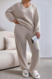 Plus Size Ribbed V-Neck Drop Shoulder Top and Pants Set