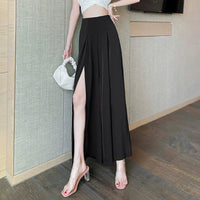 Dance into summer with our slit wide-leg pants, designed for elegance and movement. Featuring a thin straight drape and unique fishtail design, these niche swing pants are perfect for any stylish occasion.