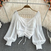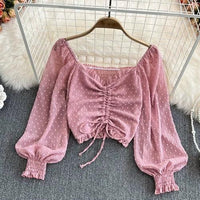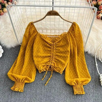 Elevate your style with our inspired pleated crop top blouse for women. Featuring a sexy, solid color design, this trendy shirt adds a chic touch to any outfit.